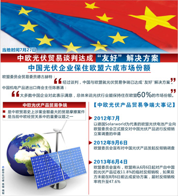 隨即,商務(wù)部網(wǎng)站發(fā)表了商務(wù)部新聞發(fā)言人沈丹陽(yáng)的談話,對(duì)中歐達(dá)成價(jià)格承諾安排表示贊賞和歡迎。歐委會(huì)貿(mào)易委員德古赫特也于當(dāng)?shù)貢r(shí)間27日在布魯塞爾宣布了這一消息,他說,經(jīng)過數(shù)周緊張談判,中歐就光伏爭(zhēng)端已達(dá)成“友好”解決方案,歐盟很高興取得一份滿意的有關(guān)中國(guó)輸歐光伏產(chǎn)品的價(jià)格協(xié)議。