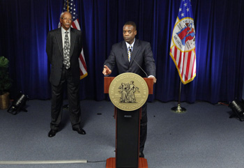7月18日,美國底特律緊急財政管理人凱文·奧爾(右)在底特律出席新聞發布會。奧爾當天獲密歇根州州長里克·斯奈德授權,向位于底特律的美國破產法院遞交破產申請。 新華社/美聯 |