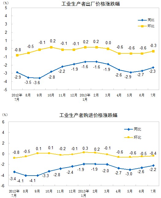 2013年7月份,全國工業生產者出廠價格同比下降2.3%,環比下降0.3%。工業生產者購進價格同比下降2.2%,環比下降0.4%。1-7月平均,工業生產者出廠價格同比下降2.2%,工業生產者購進價格同比下降2.3%。