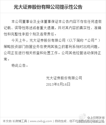 不過14:22上交所官方微博轉發的光大證券股份有限公司提示性公告中稱:“今天上午,光大證券股份有限公司策略投資部門自營業務在使用其獨立的套利系統時出現問題,公司正在進行相關核查和處置工作。”據媒體報道,上海交易所已聯系上光大,暴漲是光大系統問題,他們技術人員在查,但還沒查出原因。