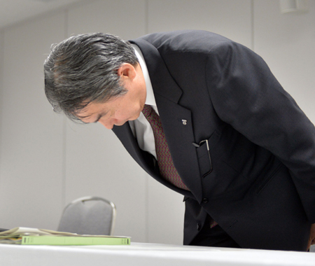 日本福島第一核電站又曝放射性污水大量泄漏事故,日本原子能規制委員會21日舉行記者會稱,可能會將這次事故的級別從最初的1級(異常)提升至3級(嚴重)。 東京電力公司21日稱,19日至20日大約300噸高濃度放射性污水從地面蓄水罐泄漏,就泄漏量而言,這是2011年福島核事故發生以來最嚴重的單次泄漏。 上圖為日本福島第一核電站20日的航拍照片。 路透社 下圖為21日東京電力公司執行副總裁Bungo Aizawa在公司總部舉行的新聞發布會上鞠躬。 法新社