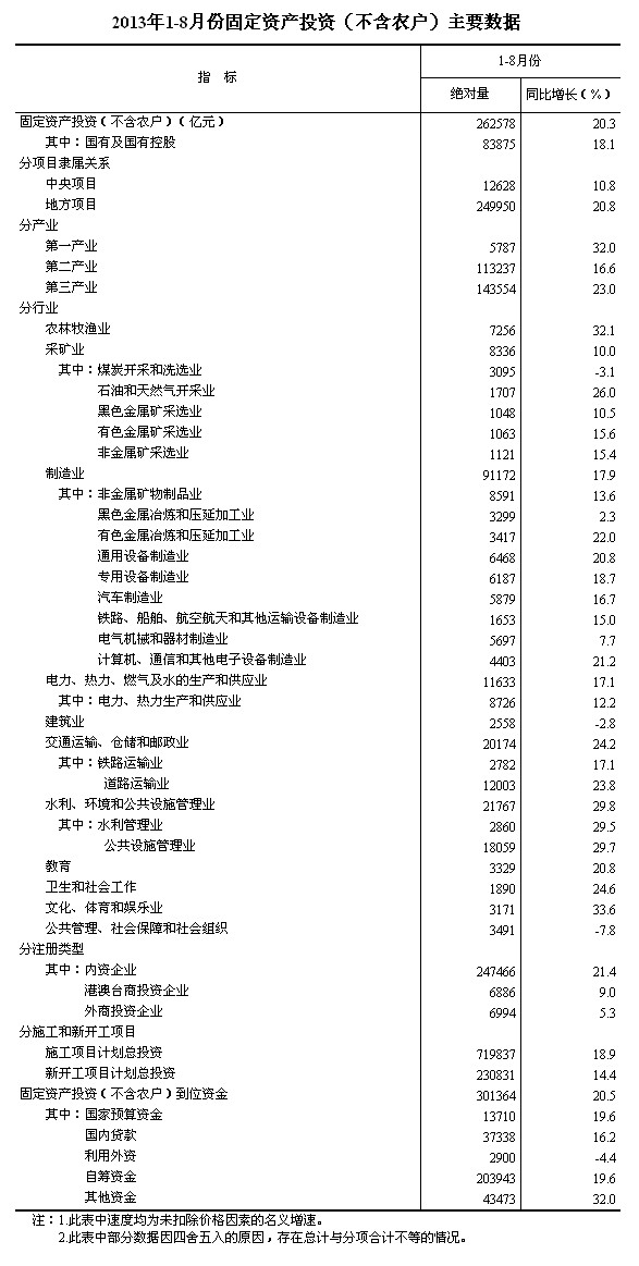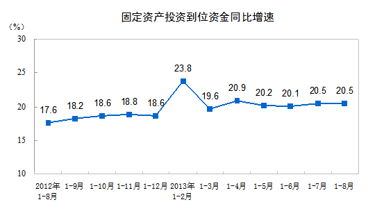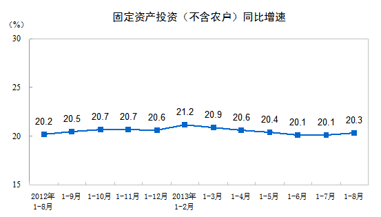 國家統計局10日公布數據顯示,2013年1-8月份,全國固定資產投資(不含農戶)262578億元,同比名義增長20.3%,增速比1-7月份加快0.2個百分點。從環比看,8月份固定資產投資(不含農戶)增長1.61%。