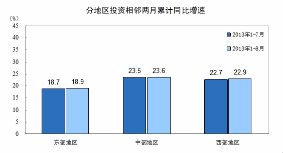 分地區看,1-8月份,東部地區投資123485億元,同比增長18.9%,增速比1-7月份加快0.2個百分點;中部地區投資73287億元,增長23.6%,增速加快0.1個百分點;西部地區投資64313億元,增長22.9%,增速加快0.2個百分點。