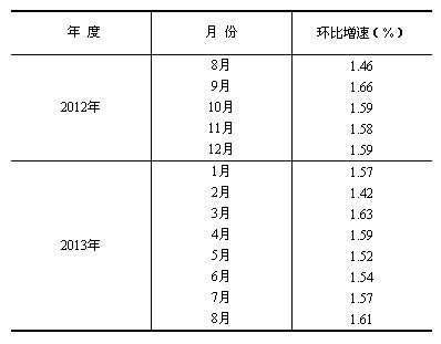 根據季節調整模型自動修正程序,對2012年8月份以來的固定資產投資(不含農戶)環比增速進行修訂。修訂結果及2013年8月份環比數據如下: