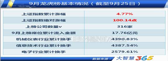 據(jù)大智慧統(tǒng)計(jì)數(shù)據(jù)顯示,截至9月25日,龍虎榜的上榜家數(shù)共有316家,資金凈流入17.76億元。表現(xiàn)最為活躍的3個行業(yè)仍然是機(jī)械儀表行業(yè)、信息技術(shù)行業(yè)和電子行業(yè),累計(jì)換手率分別達(dá)到了4390.83%、4387.54%以及2579.61%。這3個行業(yè)在7月和8月龍虎榜中也是表現(xiàn)最為活躍,涌現(xiàn)出多只漲勢凌厲的個股。在最活躍的機(jī)械儀表行業(yè)里面,換手率排名靠前的個股分別是戴維醫(yī)療(282.45%)、三維絲(238.51%)、桑樂金(214.03%)、博林特(203.85%)和江蘇宏寶(194.74%)。這幾只股票在9月都取得了不錯的漲幅。
