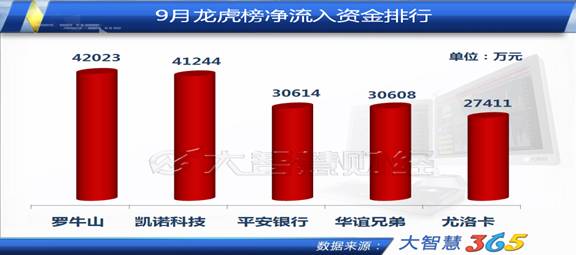 9月龍虎榜中,資金凈流入的前5個股分別是羅牛山、凱諾科技、平安銀行、華誼兄弟以及尤洛卡。在機(jī)構(gòu)及游資的追捧下,這五只個股也表現(xiàn)不俗。其中羅牛山是土改概念股,華誼兄弟是文化傳媒股。十八屆三中全會上極有可能出臺土改政策利好,而文化傳媒板塊既有政策扶持,又有優(yōu)秀的業(yè)績支撐,這兩個板塊成為資金追逐的熱點(diǎn)在情理之中。凱諾科技為重組概念,重組概念股一貫就是市場青睞的對象。
