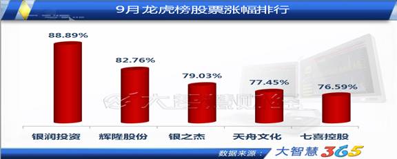 9月龍虎榜股票漲幅排行榜也驗(yàn)證了這一點(diǎn)。以88.89%的漲幅排名第一的銀潤投資為重組概念股,漲幅第2的輝隆股份和漲幅第4的天舟文化,為土改概念股和文化傳媒股。大智慧投資顧問余磊表示,在經(jīng)過暑期檔多部電影創(chuàng)下過億票房后,文化傳媒股的三季報或能有優(yōu)異表現(xiàn),屆時或又將迎來一番炒作。