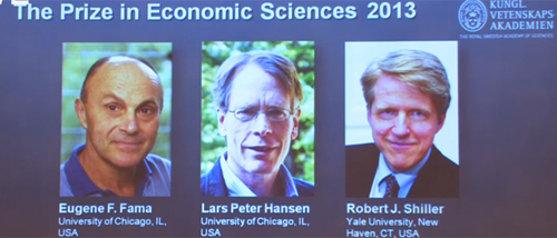 2013年度諾貝爾經濟學獎獲得者:尤金·法馬、拉爾斯·皮特·漢森、羅伯特·J·席勒(由左至右)