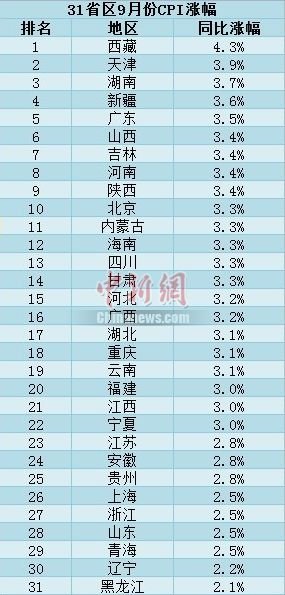 中新網(wǎng)記者梳理發(fā)現(xiàn),與全國3.1%的漲幅相比,西藏、天津、湖南、新疆、廣東、山西、吉林、河南、陜西、北京、內(nèi)蒙古、海南、四川、甘肅、河北、廣西這16個省區(qū)市的9月份CPI漲幅超過了全國水平。