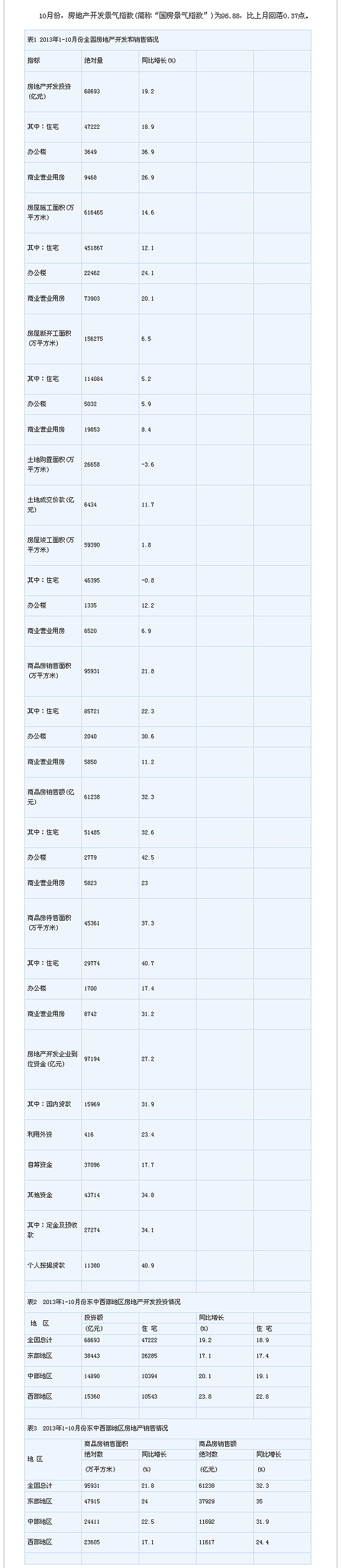 10月份,房地產(chǎn)開發(fā)景氣指數(shù)(簡稱“國房景氣指數(shù)”)為96.88,比上月回落0.37點(diǎn)。
