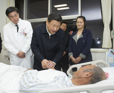 11月24日,中共中央總書記、國(guó)家主席、中央軍委主席習(xí)近平來到山東青島,考察黃島經(jīng)濟(jì)開發(fā)區(qū)黃濰輸油管線泄漏引發(fā)爆燃事故搶險(xiǎn)工作。圖為習(xí)近平在青島大學(xué)附屬醫(yī)院黃島分院看望慰問傷員。
