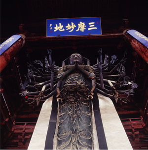 最高大、最古老的千手千眼觀音 大悲閣是隆興寺的主體建筑,閣內(nèi)供奉聞名遐邇的宋代銅鑄“千手千眼觀音菩薩”,俗稱“正定府大菩薩”。它為北宋開寶四年(971)奉太祖趙匡胤之命鑄造。像高21.3米,共42臂,除本身的兩只手、眼外,在身體左右各有20只手,分別執(zhí)日、月、凈瓶、金剛杵、寶劍等法器。銅像身軀高大,比例適度,其形體之巨、雕工之細(xì)實為罕見,是世界上古代銅鑄佛像中最高大、最古老的千手千眼觀世音菩薩像。
