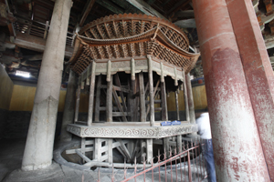 最古老的轉(zhuǎn)輪藏 轉(zhuǎn)輪藏直徑七米,是一座收藏經(jīng)文的旋轉(zhuǎn)書架,外觀形似八角形亭子,中設(shè)木軸,亭身設(shè)有經(jīng)屜,可以存放佛經(jīng),推之可轉(zhuǎn)動。取佛教“法輪常轉(zhuǎn),自動不息”之意,喻佛法猶如輪子輾轉(zhuǎn)相傳,永不停息。佛教中亦有推其旋轉(zhuǎn)與誦讀經(jīng)文同功之說。這種建筑形制國內(nèi)保存下來的甚少,主要有四川平武報恩寺華嚴(yán)店和北京智化寺藏殿的明代轉(zhuǎn)輪藏、北京頤和園萬壽山和山西五臺山塔院寺大藏經(jīng)閣清代轉(zhuǎn)輪藏、正定隆興寺轉(zhuǎn)輪藏閣內(nèi)的宋代轉(zhuǎn)輪藏,因此稱其是中國現(xiàn)存最早的轉(zhuǎn)輪藏。