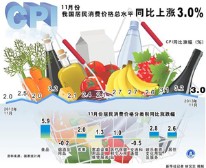 國家統(tǒng)計局9日公布,11月居民消費價格總水平(CPI)同比上漲3.0%,漲幅較10月回落0.2個百分點,低于此前3.2%的市場普遍預(yù)期,近3個月來首次漲勢放緩。