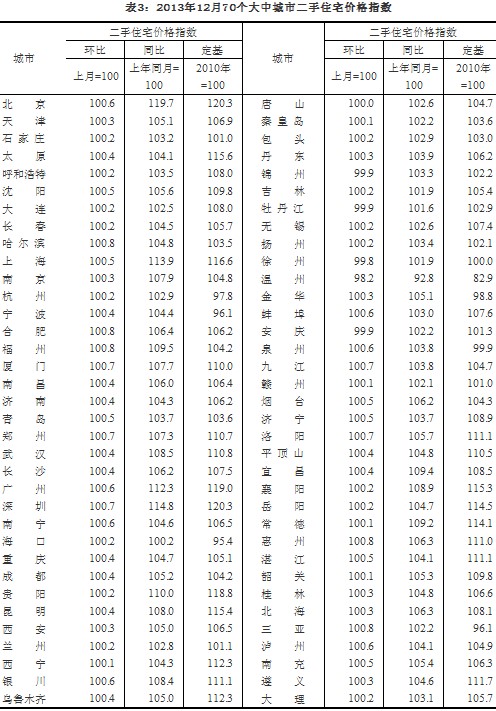 (二)與上年同月相比,70個大中城市中,價格下降的城市有1個,上漲的城市有69個。12月份,同比價格變動中,最高漲幅為19.7%,最低為下降7.2%。