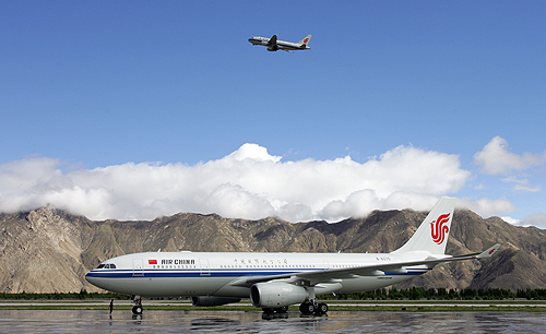 國航西南分公司空客A330飛機抵達(dá)拉薩貢嘎機場(空中為國航空客A319飛機起飛)