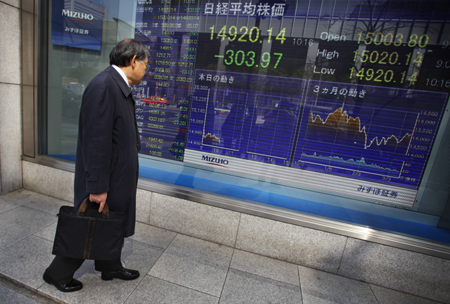 受外部市場普遍低迷、日元對美元匯率明顯回漲以及經濟數據利空等多重因素打壓,當日東京股市大幅走跌,日經225種股票平均價格指數收盤時比前一個交易日下跌2.59%,失守15000點大關。圖為在日本首都東京,一名男子觀看股指電子顯示屏。