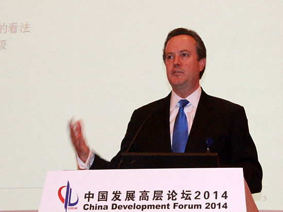 “中國發(fā)展高層論壇2014”于3月22日-24日在釣魚臺舉行。上圖為麥格希財訊集團總裁道格拉斯·彼得森在《透視政府債務風險》主題論壇發(fā)言。