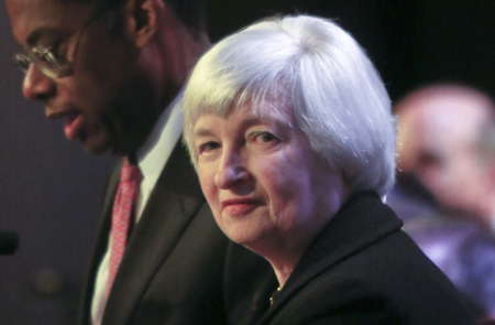 美國聯(lián)邦儲備委員會主席珍妮特·耶倫4月16日表示,根據(jù)中期預(yù)測,美國經(jīng)濟(jì)有望在保持價格穩(wěn)定的條件下回歸充分就業(yè)。美國失業(yè)率將在2016年底降到5.2%至5.6%,通脹率將升到1.7%至2%。美聯(lián)儲刺激措施仍將持續(xù)相當(dāng)時間,加息將取決于就業(yè)和通脹的改善程度。 圖為當(dāng)日珍妮特·耶倫(中)在紐約經(jīng)濟(jì)俱樂部出席活動。