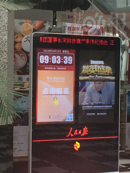 在熙攘人群中記者注意到,大堂一側滾梯旁立有人民日報電子公告屏幕,上面顯示有日期時間及精英盛典廣告。