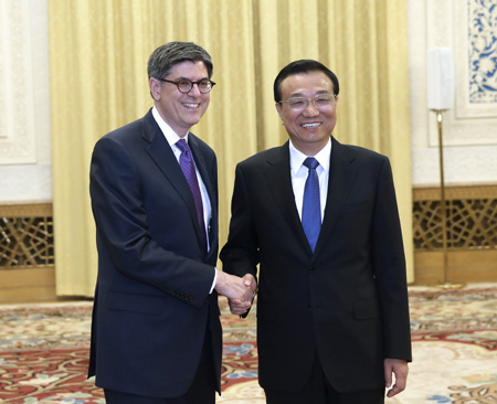 5月13日,國務院總理李克強在北京人民大會堂會見美國總統特別代表、財政部長雅各布·盧。 李克強表示,中方愿與美方拓展貿易投資、能源環保、氣候變化等領域務實合作,推進雙邊投資協定談判進程。希望美方采取切實措施放寬民用高技術物項對華出口,為中國企業赴美投資提供公平競爭環境。