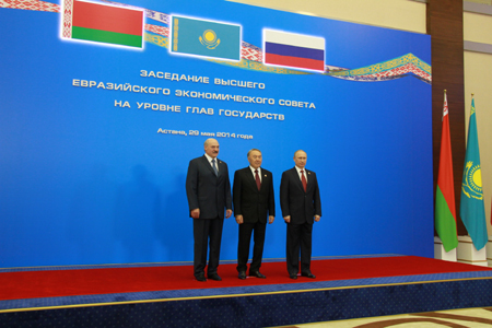 俄羅斯、白俄羅斯、哈薩克斯坦三國(guó)總統(tǒng)5月29日在哈首都阿斯塔納簽署《歐亞經(jīng)濟(jì)聯(lián)盟條約》。根據(jù)條約,歐亞經(jīng)濟(jì)聯(lián)盟將于明年1月1日正式啟動(dòng),到2025年俄白哈三國(guó)將實(shí)現(xiàn)商品、服務(wù)、資金和勞動(dòng)力的自由流動(dòng),終極目標(biāo)是建立類似于歐盟的經(jīng)濟(jì)聯(lián)盟。條約涉及能源、交通、工業(yè)、農(nóng)業(yè)、關(guān)稅、貿(mào)易、稅收和政府采購(gòu)等諸多領(lǐng)域。