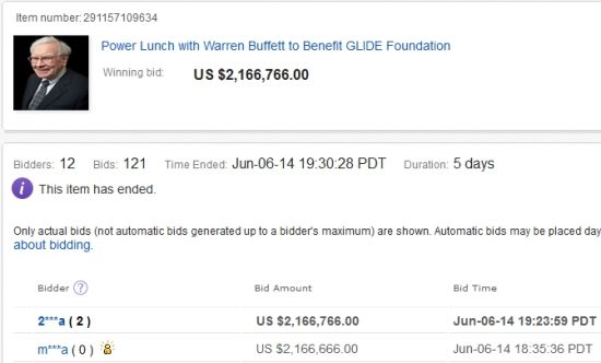北京時間6月7日上午消息,北京時間6月7日上午10點半,經過12位出價人121次激烈角逐,2014年巴菲特慈善午餐價落槌在216.6766萬美元(人民幣1353萬元),超越去年的“低價”紀錄。