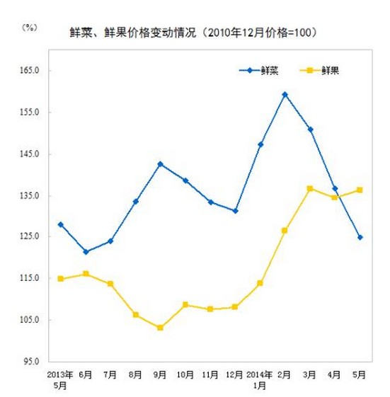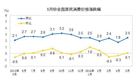 2014年5月份,全國居民消費價格總水平同比上漲2.5%。其中,城市上漲2.5%,農(nóng)村上漲2.3%;食品價格上漲4.1%,非食品價格上漲1.7%;消費品價格上漲2.4%,服務(wù)價格上漲2.7%。1-5月平均,全國居民消費價格總水平比去年同期上漲2.3%。