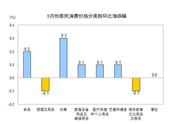 5月份,全國居民消費價格總水平環(huán)比上漲0.1%。其中,城市上漲0.1%,農(nóng)村上漲0.2%;食品價格上漲0.2%,非食品價格上漲0.1%;消費品價格上漲0.1%,服務(wù)價格持平(漲跌幅度為0,下同)。
