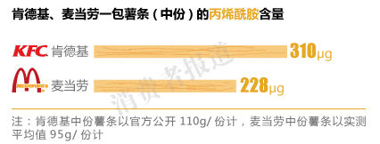 基于本次檢測結(jié)果,本刊記者粗算出一包肯德基中份薯?xiàng)l含丙烯酰胺310μg,而同分量的麥當(dāng)勞薯?xiàng)l含228μg。(如圖)如果實(shí)在難以抵擋美味,偶爾吃下,消費(fèi)者可選擇份量小、丙烯酰胺含量低的薯?xiàng)l以滿足嘴癮。