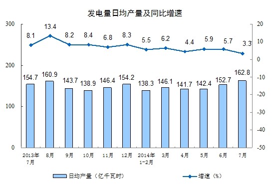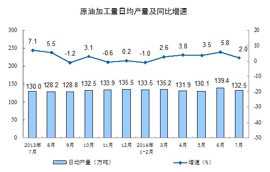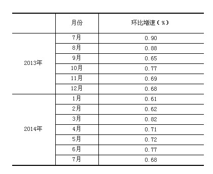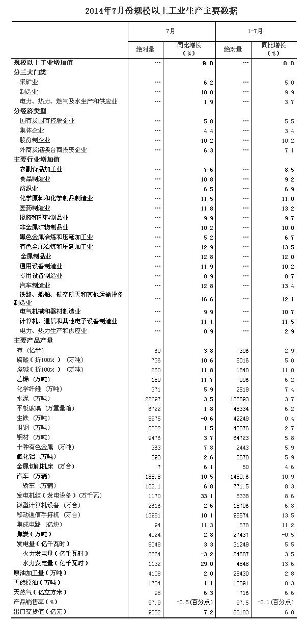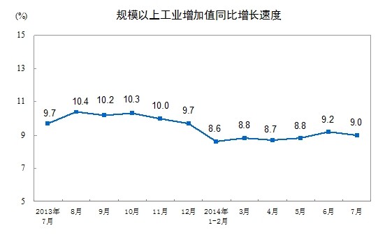 2014年7月份,規模以上工業增加值同比實際增長9.0%(以下增加值增速均為扣除價格因素的實際增長率),比6月份回落0.2個百分點。從環比看,7月份比上月增長0.68%。1-7月份,規模以上工業增加值同比增長8.8%。