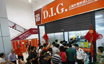 位于上海外高橋的進(jìn)口商品直銷中心在上午十點(diǎn)開門時(shí),市民涌進(jìn)入口處。