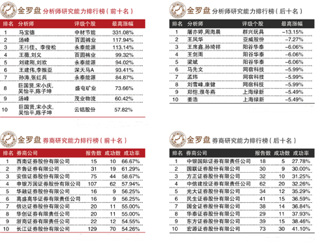 從分析師研究能力來看,國聯證券分析師馬寶德推薦的個股中材節能在20日短線評測中漲幅高達331.08%,在8月金羅盤分析師研究能力排行中一舉奪魁。而申銀萬國證券分析師推薦的個股群興玩具,在20日短線評測中錄得的最高漲幅為-13.15%,成績遠遠差于其他股票的表現,最終位列榜單倒數第一。