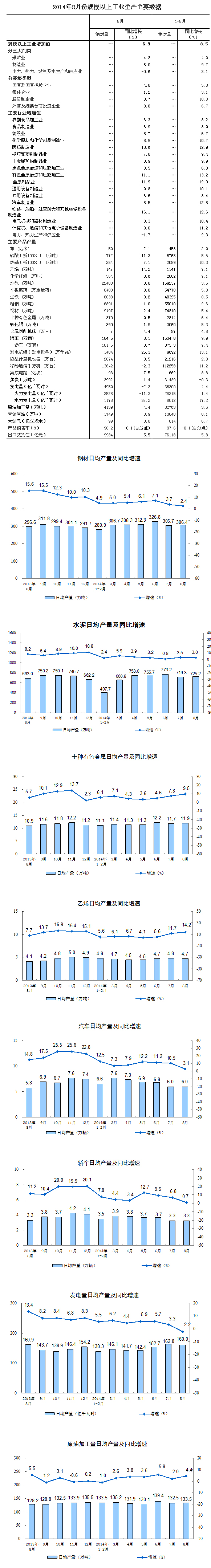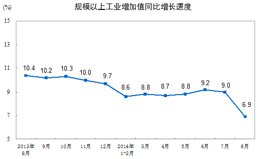 2014年8月份,規(guī)模以上工業(yè)增加值同比實際增長6.9%(以下增加值增速均為扣除價格因素的實際增長率),比7月份回落