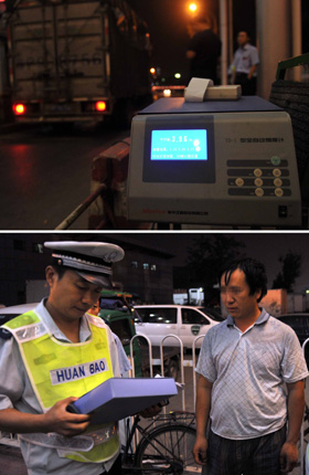 環境監察人員對進京的尾氣排放超標的貨車進行處罰。 記者