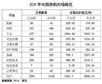 Wind統計數據則顯示,僅2014年以來,中國公司已經完成的并購交易數目就達到1256宗,交易總價值達到7222億元;未完成的并購交易數目則達到1419宗,涉及金額更是高達9869億元,合計達到1.7萬億元之巨。相比之下,在重組相當活躍的2013年,全年并購交易也只有1296家次,金額合計6330億元。