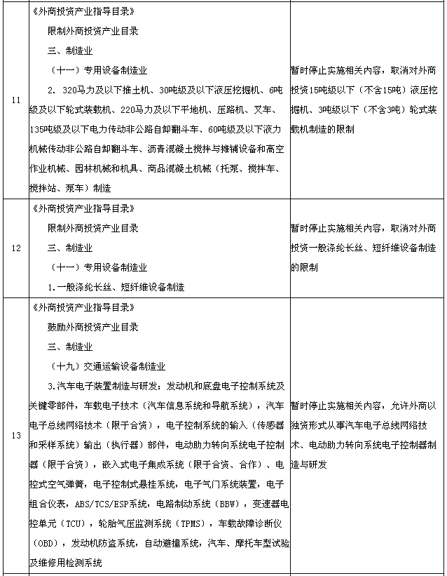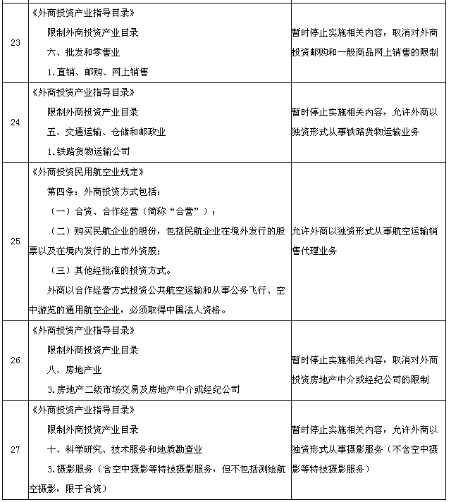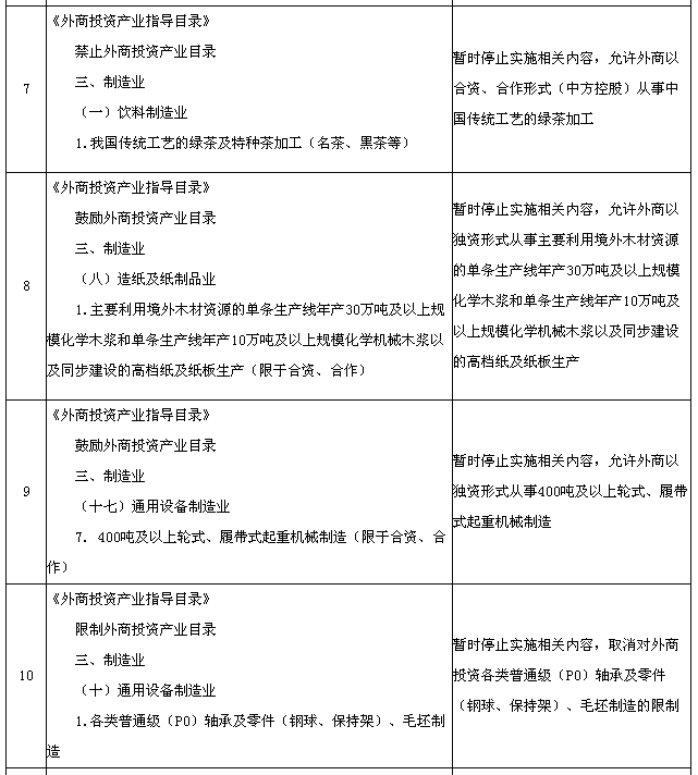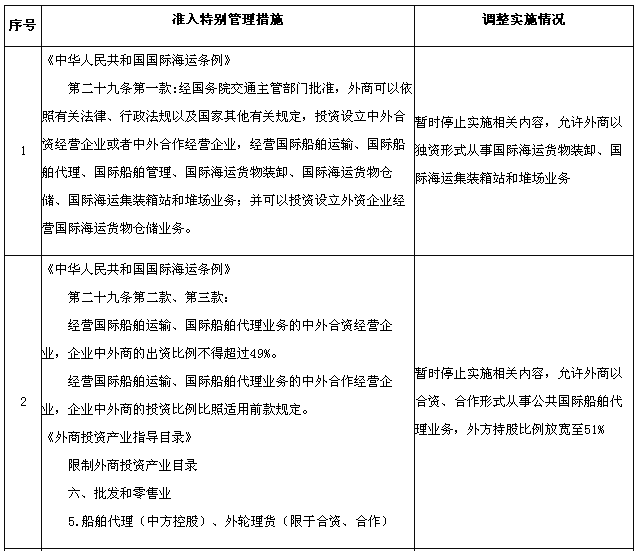 為適應在中國(上海)自由貿易試驗區進一步擴大開放的需要,國務院決定在試驗區內暫時調整實施《中華人民共和國國際海運條例》、《中華人民共和國認證認可條例》、《鹽業管理條例》以及《外商投資產業指導目錄》、《汽車產業發展政策》、《外商投資民用航空業規定》規定的有關資質要求、股比限制、經營范圍等準入特別管理措施(目錄附后)。