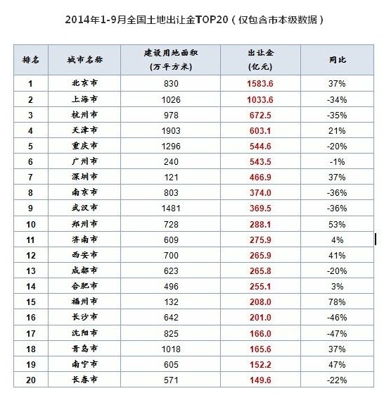 10月9日,中國指數研究院發布報告顯示,1-9月,全國300個城市土地出讓金總額為17109億元,同比減少20%。其中,住宅用地(含住宅用地及包含住宅用地的綜合性用地)出讓金總額為11514億元,同比減少20%。北京、上海分別以1584億元和1034億元的總額領跑全國,杭州位列第三。受三季度成交量整體下滑影響,榜單中僅半數城市出讓金同比增加,福州漲幅最高,為78%;杭州等6城市跌幅超三成。