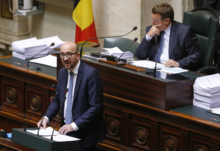 10月14日,比利時(shí)新任首相夏爾·米歇爾(左下)在首都布魯塞爾的聯(lián)邦議會發(fā)表施政演說。 他表示,促進(jìn)就業(yè)將是新政府施政方針的重中之重。為了促進(jìn)和保護(hù)就業(yè),新政府計(jì)劃撥付40億歐元,同時(shí)決定降低勞動力成本。新政府還將制定一系列措施鼓勵(lì)年輕人和長期失業(yè)者走上工作崗位。