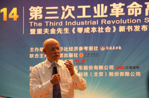 圖1:美國著名趨勢學家里夫金在“2014第三次工業革命高峰論壇”上演講。王皓然/攝 |
