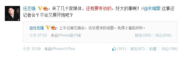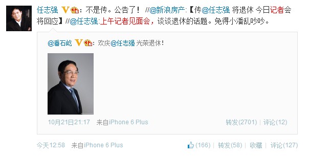 據(jù)南方都市報消息,昨晚地產商潘石屹發(fā)微博稱:“歡慶@任志強光榮退休!”隨后,地產大佬、華遠地產董事長任志強通過微博回應,公司已公告新的董事人選,還有一個月。關于退休生活,他說,“咱也準備改行弄點學術研究,當個啥作家”。