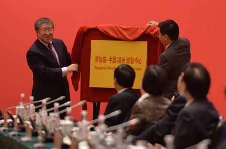 10月27日,中國新加坡雙邊合作聯委會第十一次會議、中國新加坡蘇州工業園區聯合協調理事會第十六次會議和中國新加坡天津生態城聯合協調理事會第七次會議在蘇州舉行。中新雙方總結了各方面合作進展情況,就進一步深化經濟轉型、金融合作、人文交流、包容和可持續發展等領域合作深入交換意見,達成一系列重要共識。雙方還宣布兩國外匯市場正式推出人民幣對新加坡元直接交易。圖為中新兩國代表為新加坡-中國(蘇州)創新中心揭牌。