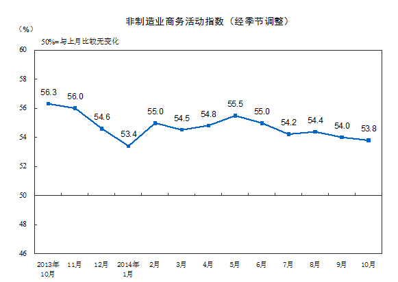 2014年10月,中國非制造業商務活動指數為53.8%,比上月回落0.2個百分點,高于榮枯線3.8個百分點,表明我國非制造業繼續保持擴張態勢。