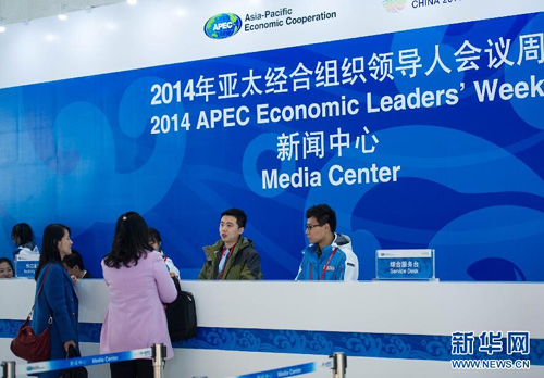11月4日,國家會議中心新聞中心綜合服務臺的工作人員在提供咨詢服務。當日,2014年亞太經合組織(APEC)領導人會議周兩個新聞中心之一的國家會議中心新聞中心正式啟用向媒體記者開放。據介紹,新聞中心總面積約11000平方米,全面覆蓋免費無線網絡,將為媒體提供視頻、文字、圖片綜合素材和專業的廣播電視服務。新華社記者 陳曄華/攝