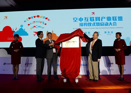 圖四:11日晚,國航牽頭成立了國內首個“空中互聯網產業聯盟”,旨在為機艙乘客提供優質的實時互聯網服務。該聯盟由30多家各類企業組成,既有東軟,京東,銀河證券,優酷土豆這樣的業界知名企業,也有類似于好十傳媒這樣的專業企業。攝影:李賀。