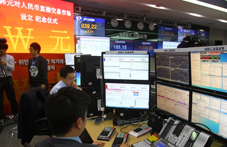 韓中銀行間韓元對人民幣直接交易12月1日上午9時在韓正式啟動,這是韓國離岸人民幣市場發展中具有標志性意義的事件,有助于降低貨幣兌換和交易成本。 圖為當日在韓國首爾,交易員在韓國外換銀行進行人民幣與韓元直接交易操作。
