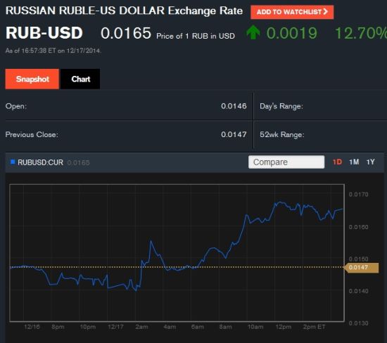 在盧布經(jīng)歷了崩盤式下跌之后,俄政府終于坐不住開始瘋狂護盤。俄財政部決定向市場出售70億美元外匯,并表示如需要會一直向市場出售美元。同時俄央行宣布了一系列穩(wěn)定金融市場措施。國際油價止跌盤中一度火箭式躥升5%,在眾多利好消息刺激下,盧布開始絕地反擊大幅升值12%,漲幅創(chuàng)1998年以來之最。