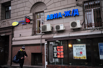 12月16日,在俄羅斯首都莫斯科,行人走過街邊的外幣兌換點。 記者