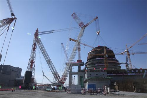 據悉,本次吊裝項目為我國三大核電基地之一的田灣核電二期工程3號機組安全殼鋼襯里穹頂整體吊裝,是繼日本大地震后全球核電的第一個穹頂吊裝。該穹頂直徑44米、高22米,含吊具總重476.4噸,起吊半徑105.4米,就位高度56.15米,為迄今國際核電建設中外形尺寸最大、重量最重、吊裝半徑最大的薄殼穹頂。