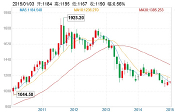 國際金價在美聯儲加息靴子落地之前料將難以見到大幅度的反彈。大多數人士對于金價2015年走勢的預期都比較悲觀。法國興業銀行認為,美國經濟復蘇和利率上升將令金價處于下行趨勢中。高盛預計2015年12月,國際金價將跌至每盎司1050美元的水平。2014年基本金屬市場也隨著油價的暴跌而大幅下挫。原油價格下跌可能進一步拉低通脹預期,并導致基本金屬被大量出售。分析指出,由于油價下跌,避險情緒主宰市場,基本金屬價格短期內仍將維持在低位,但是正在逐漸找到支撐,比如中國、歐洲和日本實施經濟刺激措施的可能性,以及美國經濟強勁的復蘇勢頭等。